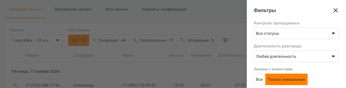 Фильтр «Контроль пропущенных» отображается в панели фильтров, когда выбраны типы звонков «Все», «Входящие» или «Пропущенные». При выборе типа звонков «Исходящие» фильтр «Контроль пропущенных» недоступен.
