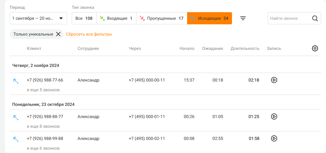 На вкладке «Исходящие» по количеству уникальных звонков вы поймете, сколько клиентов удалось обзвонить менеджерам.