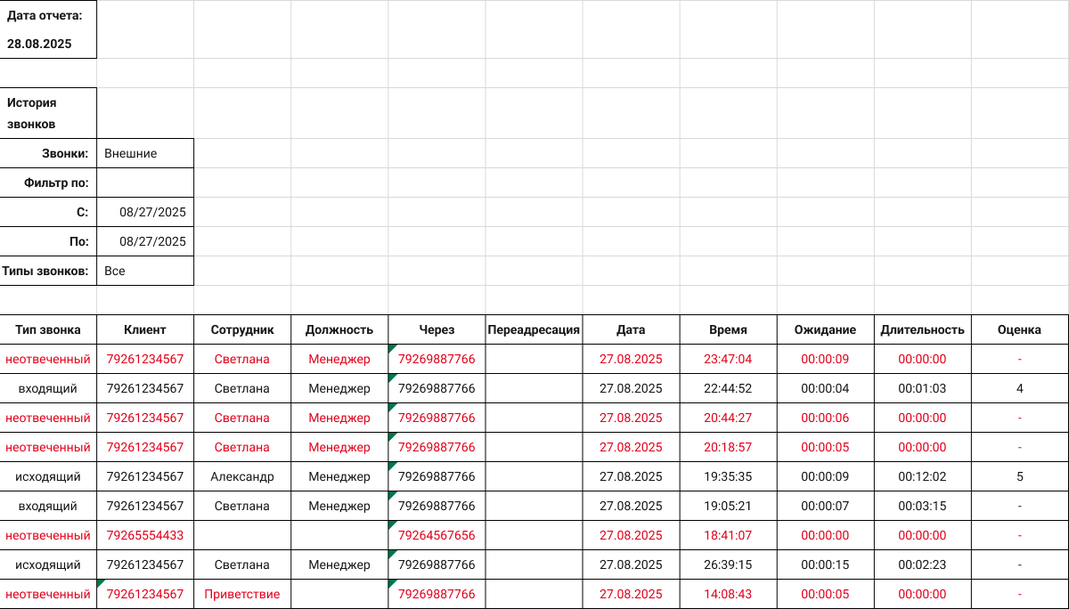 Как выгрузить историю звонков в Excel