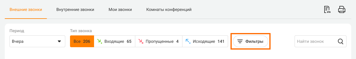 Нажмите на кнопку «Фильтры», чтобы открыть панель фильтров. С ее помощью можно отфильтровать звонки не только по клиентам, сотрудникам и номерам, но также: