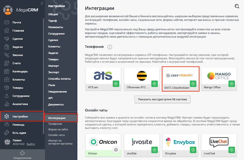 3. В личном кабинете MegaCRM перейдите в раздел “Настройки“ - “Интеграции“ – «Виртуальная АТС».