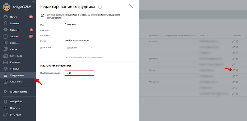 Далее зайдите в ВАТС в раздел «Настройки» → «Сотрудники» и сопоставьте внутренние номера сотрудников с внутренними номерами сотрудников на стороне MegaCRM.