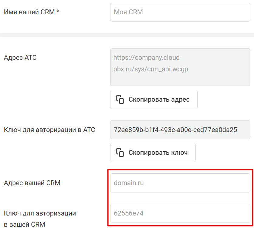 5. Введите скопированные данные в поля “Ключ для авторизации в вашей CRM“ и “Адрес вашей CRM“ в Виртуальной АТС. Нажмите «Сохранить».