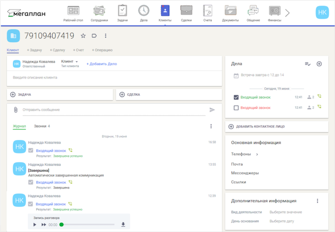 Все звонки записываются в карточку клиента.