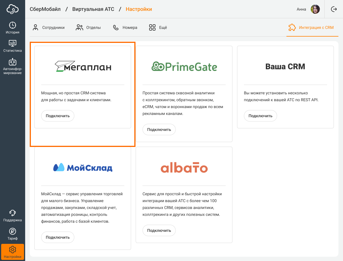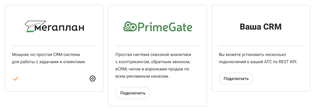3. В интерфейсе Виртуальной АТС войдите в раздел «Интеграция с CRM», там показаны карточки CRM, интеграцию с которыми вы можете установить. Пролистните вниз и найдите карточку «Мегаплан».