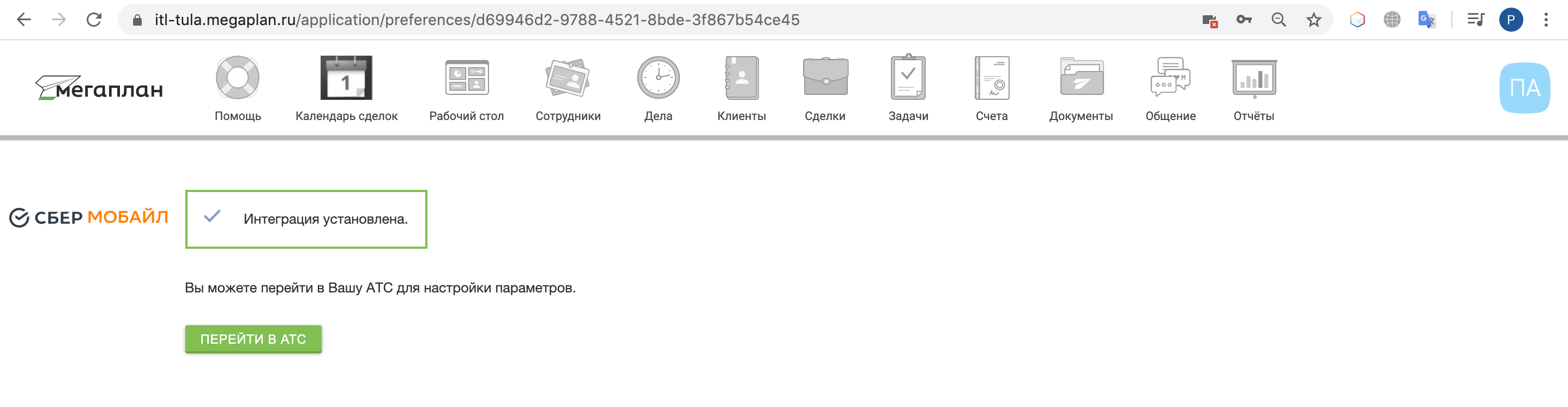 После сохранения настроек вы получите подтверждение успешной установки интеграции. Для изменения настроек вы сможете перейти в свою ВАТС: