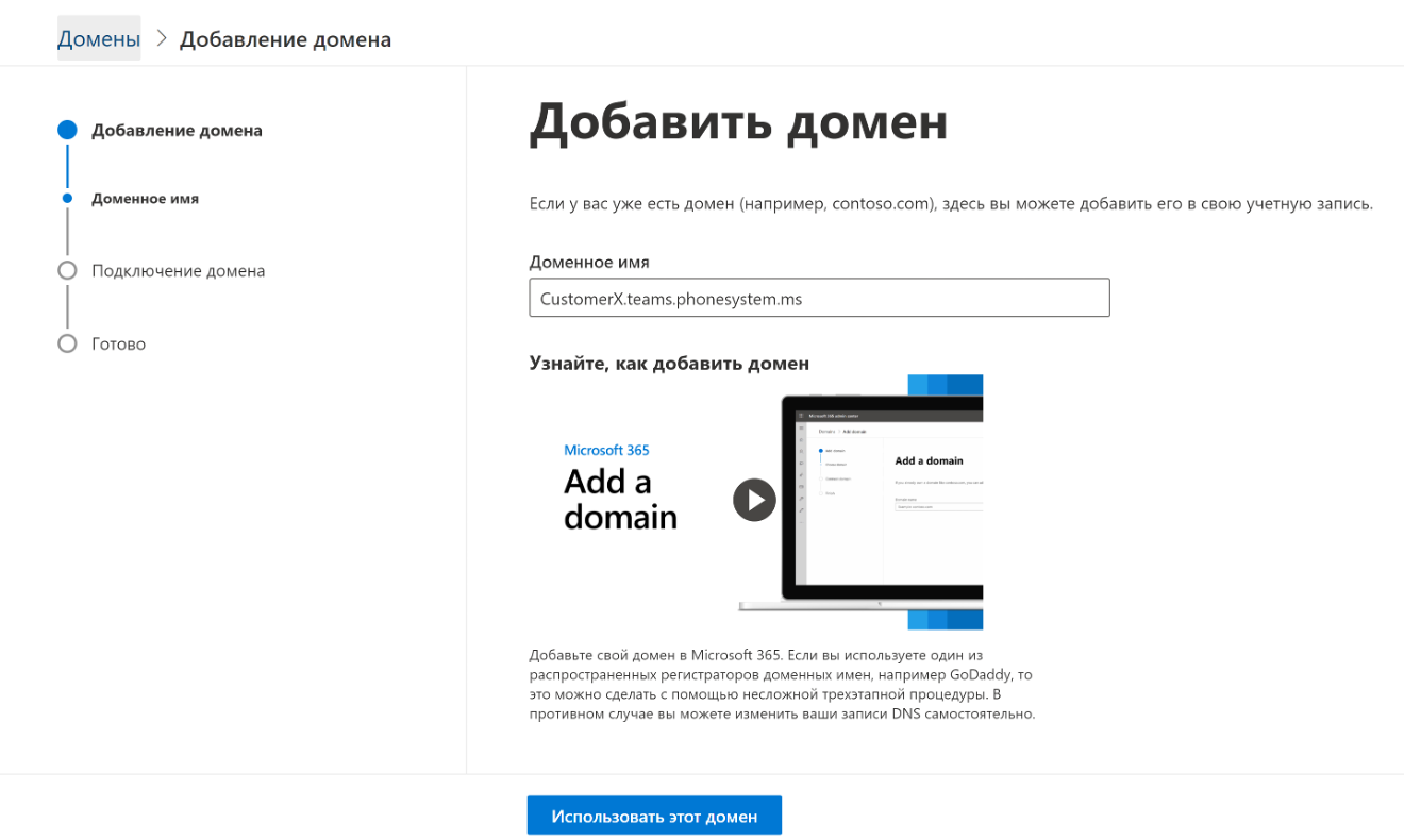 Для интеграции необходимо получить домен в зоне *.teams.phonesystem.ms, который будет использован для подключения вашей Виртуальной АТС.