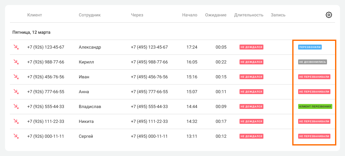 • Контроль пропущенных. Сортируйте непринятые звонки по статусам обработки.