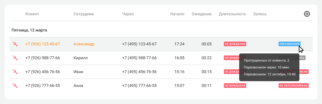 Для руководителя важно понимать, как менеджеры работают с пропущенными звонками – с какого раза удалось перезвонить или клиент так и остался без ответа.