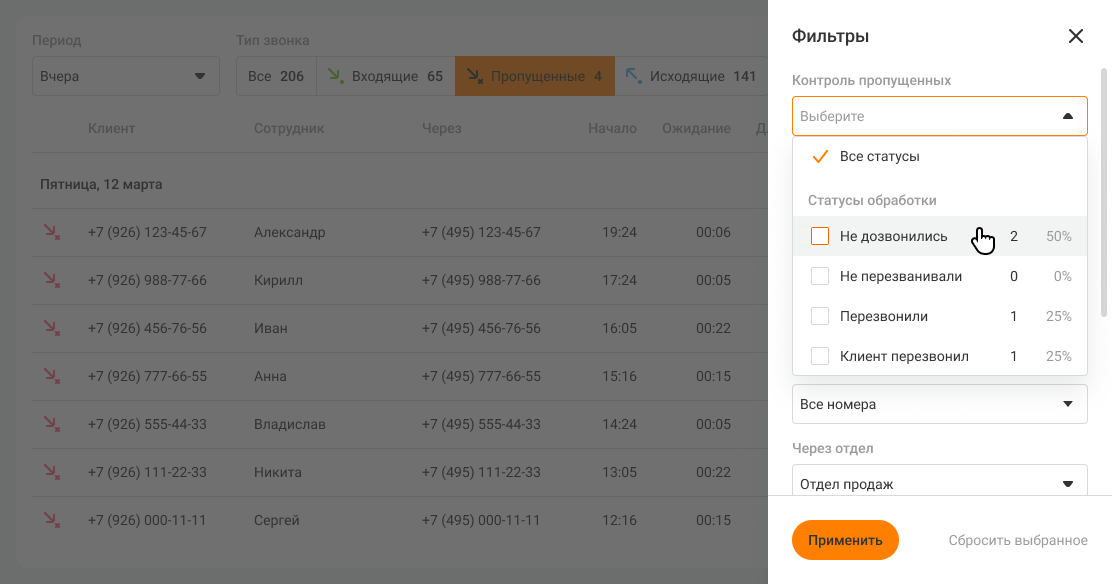 3. Отслеживайте работу менеджеров по неотвеченным звонкам с помощью фильтров: