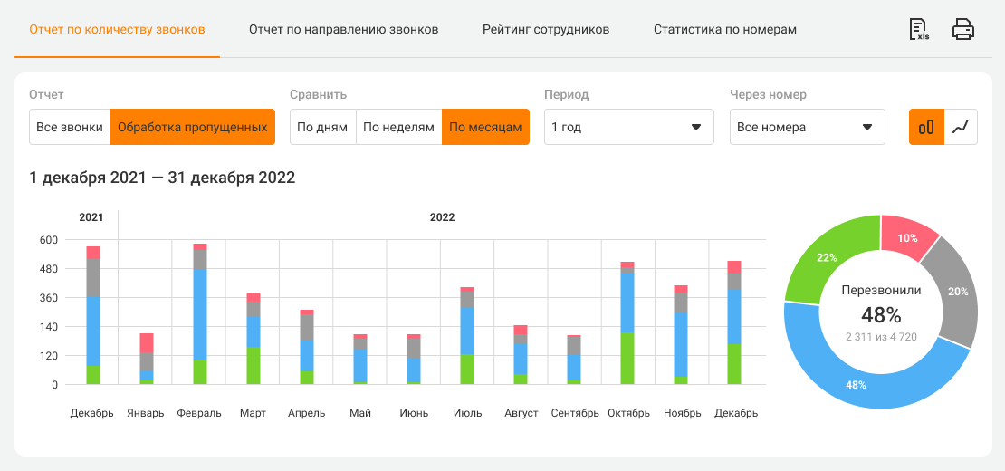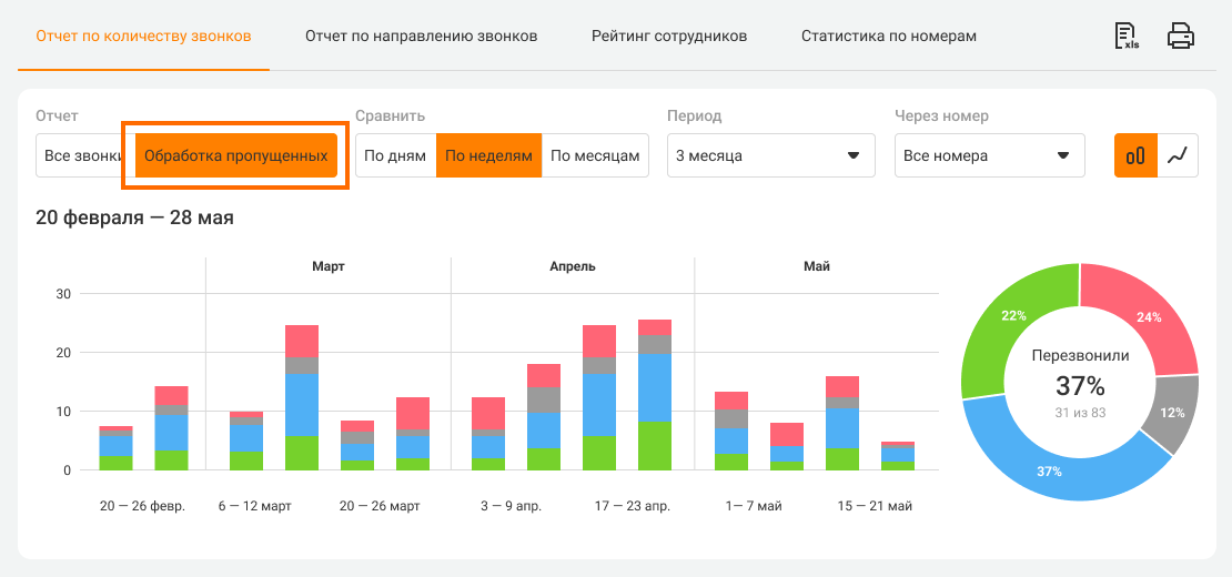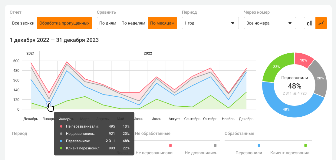 Благодаря визуализации данных, вы сможете оценить, как меняется соотношение обработанных и необработанных пропущенных за выбранный период и организовать активность менеджеров так, чтобы они эффективнее работали во время различных форс-мажоров.