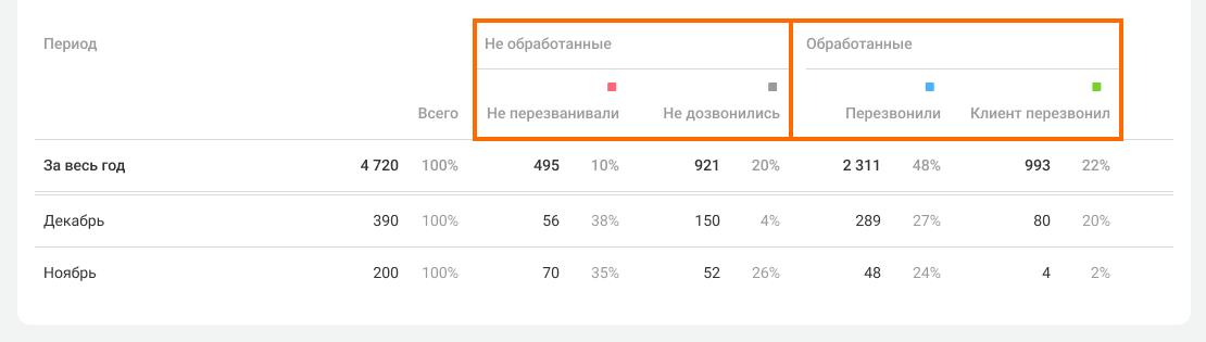 5. Если вы предпочитаете работать с цифрами, используйте данные из таблицы ниже графиков. В ней все пропущенные звонки удобно разнесены по двум столбцам – «Необработанные» и «Обработанные».