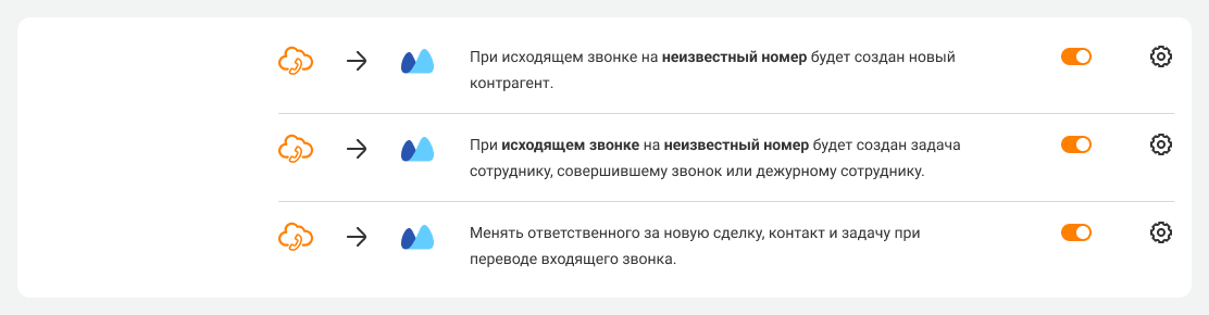 - после звонка с участием неизвестного номера (успешного и неуспешного, входящего и исходящего) могут быть автоматически созданы новый контрагент и задача на сотрудника;
