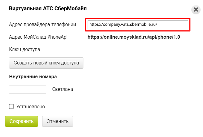 4. В поле «Адрес провайдера телефонии» вставьте адрес вашей Виртуальной АТС, скопированный на шаге 2.