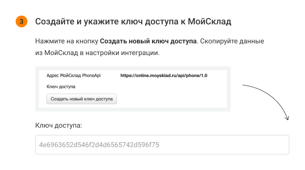 5. Нажмите кнопку «Создать новый ключ доступа» (даже если сервис МойСклад предложил вам готовый ключ). Скопируйте вновь сгенерированный код доступа.
