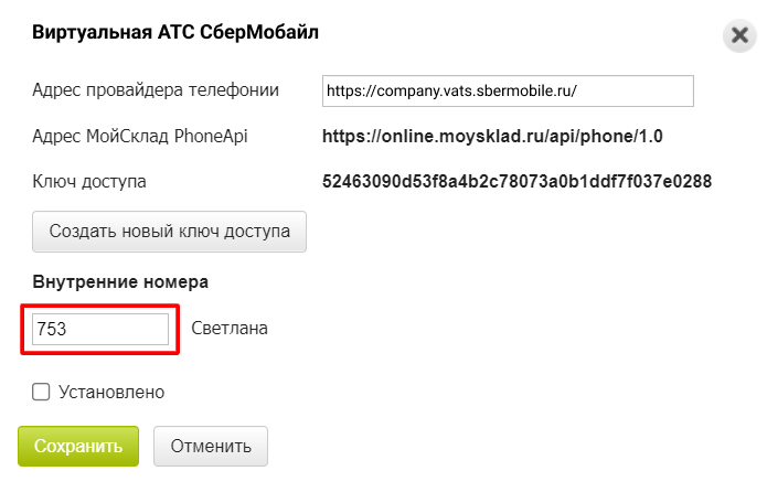 8. Поставьте «галочку» напротив «Установлено» и нажмите «Сохранить». Убедитесь, что в карточке приложения «МойСклад Phone API» появилась надпись «Установлено».