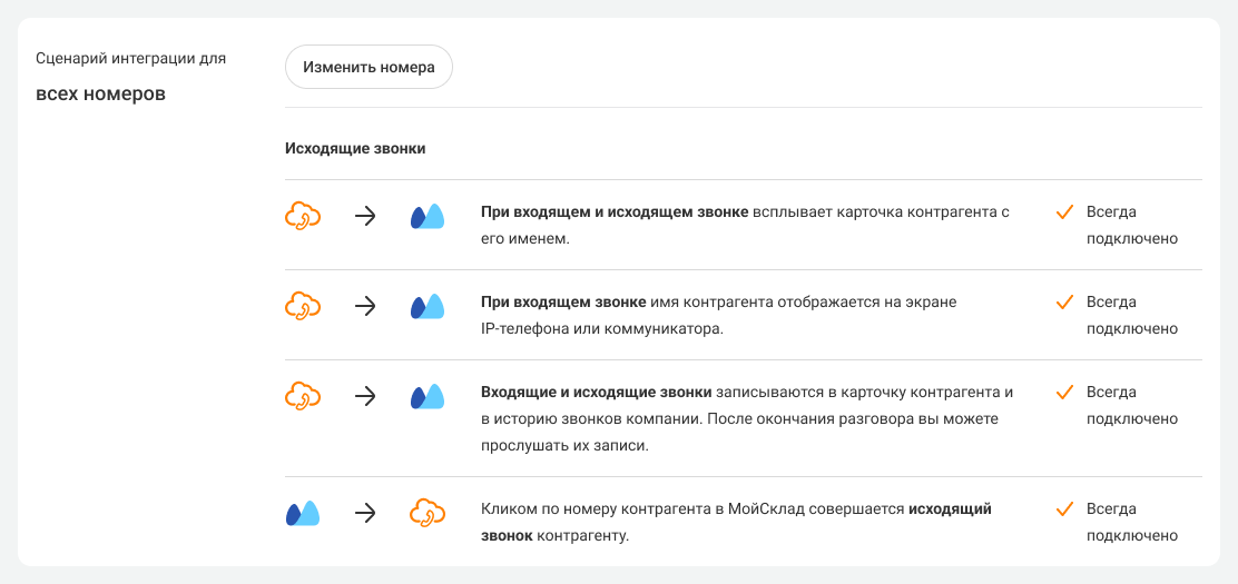 10. Настройте сценарии (правила) интеграции сервиса МойСклад и Виртуальной АТС. Некоторые сценарии интеграции подключаются автоматически без возможности внести в них изменения.