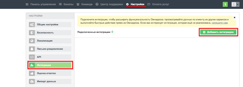 В Omnidesk зайдите в аккаунт администратора, перейдите в «Настройки» — «Интеграции» — «Добавить интеграцию».