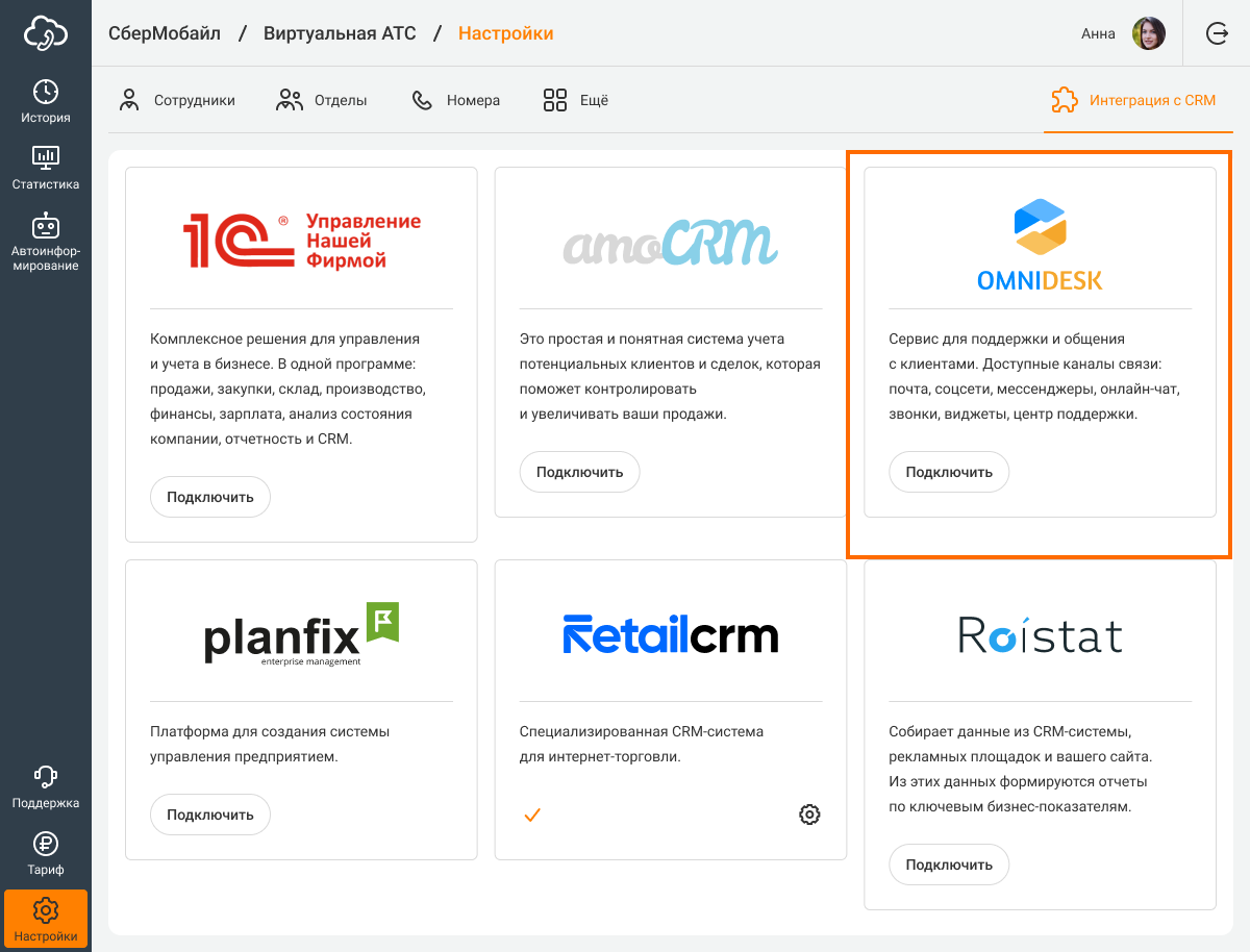 Теперь зайдите в настройки вашей Виртуальной АТС, в раздел «Интеграции с CRM». Нажмите на интеграцию с Omnidesk.