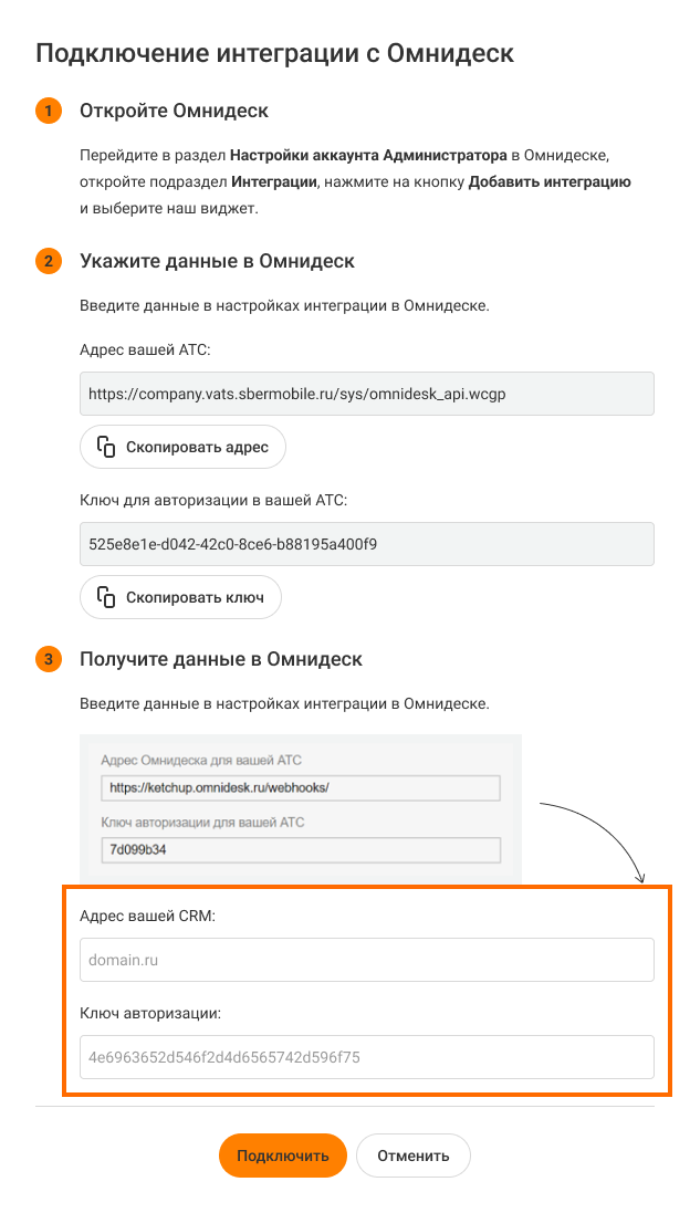 Там вы увидите адрес Омнидеска для вашей АТС и ключ авторизации. Скопируйте эти данные.