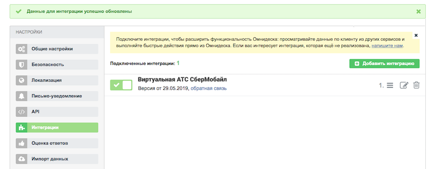 В настройках Омнидеск нажмите Сохранить изменения. Интеграция включена и работает.