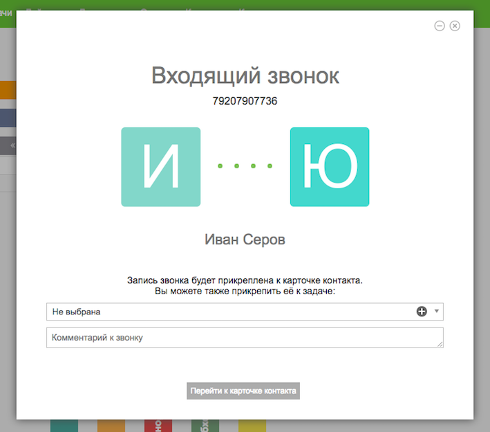 При входящем звонке от клиента, уже добавленного в контакты, вы сможете увидеть имя клиента во всплывающей карточке и обратиться к нему по имени, что увеличивает доверие и повышает лояльность.
