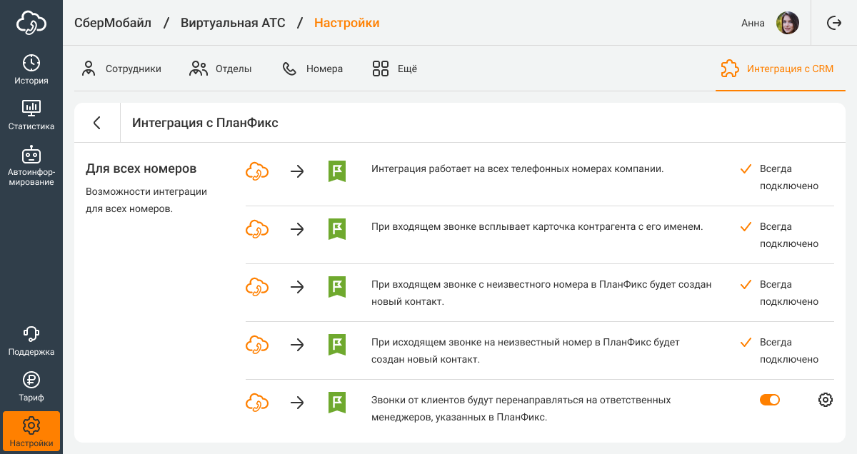 Если вы хотите, чтобы при звонке на номер вашей компании клиент не терял времени на первой линии или IVR и сразу соединялся со своим персональным менеджером, включите данную опцию в настройке интеграции в интерфейсе Виртуальной АТС.