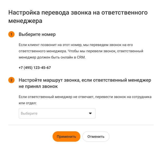 А затем данную опцию: выберите номер и настройте маршрут звонка, если ответственный менеджер не принял звонок. Можно перевести звонок на сотрудника или отдел.