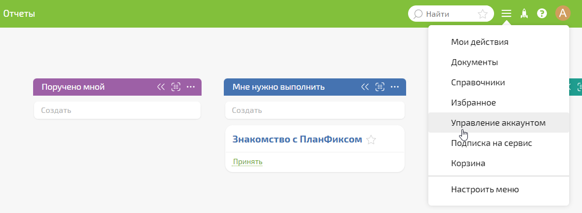 В интерфейс своего ПланФикс в правом верхнем углу экрана щелкните выпадающее меню и выберите «Управление аккаунтом».