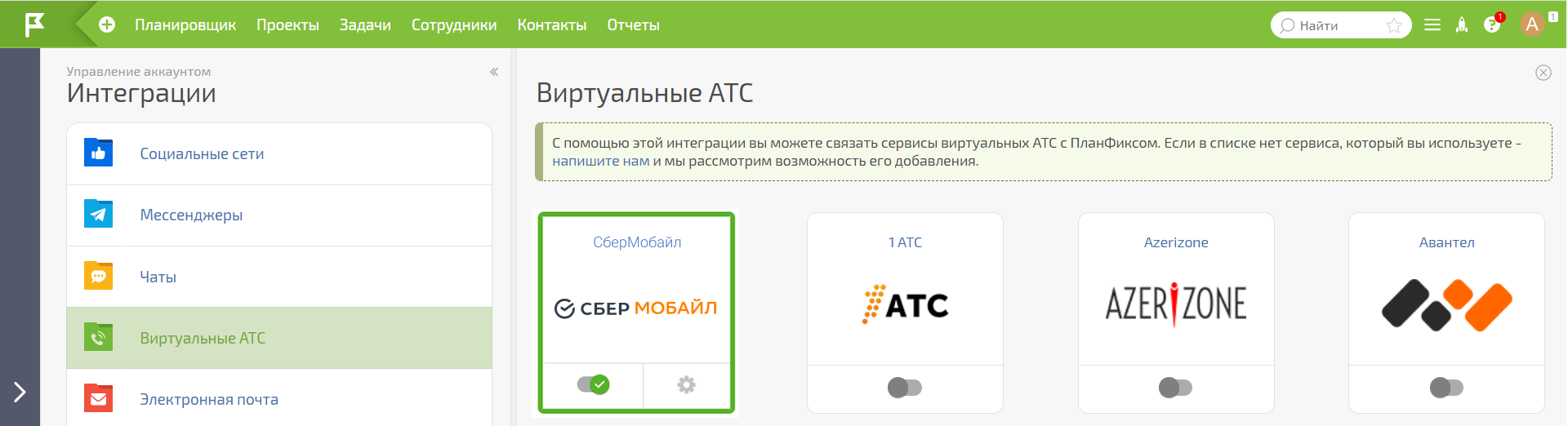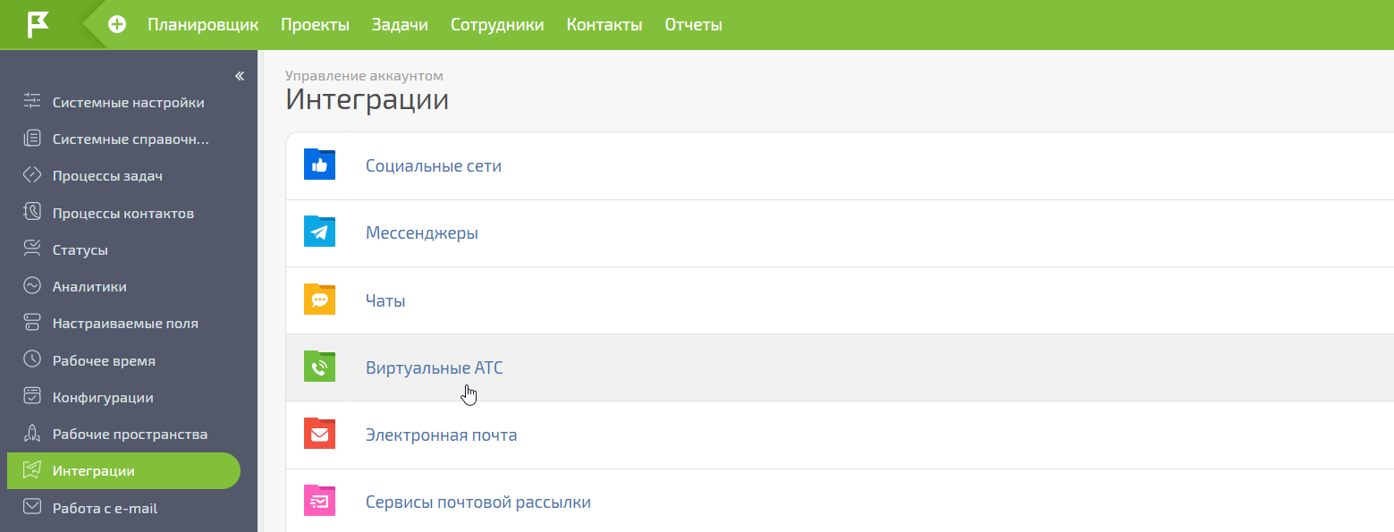 Выберите раздел «Интеграция с другими сервисами» — «Виртуальные АТС».