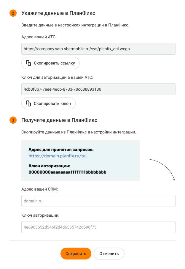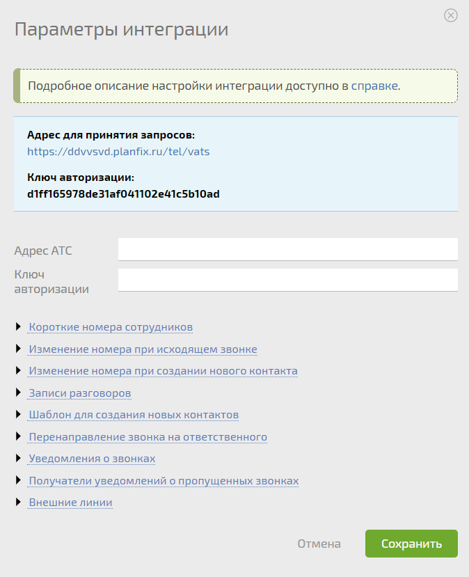 Скопируйте адрес вашей АТС, вставьте его в поле «Адрес АТС» в ПланФикс. То же самое для ключа авторизации: скопируйте его в ПланФикс и вставьте в настройках интеграции.
