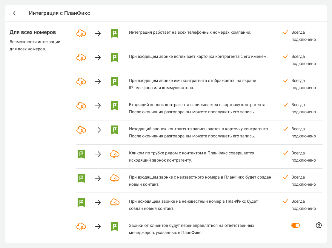 После этого вы попадете на страницу завершения настройки интеграции, где сможете прочитать описание возможностей интеграции и завершить ее настройки со стороны Виртуальной АТС: подключить или не подключать автоматическое перенаправление звонков на ответственного менеджера.