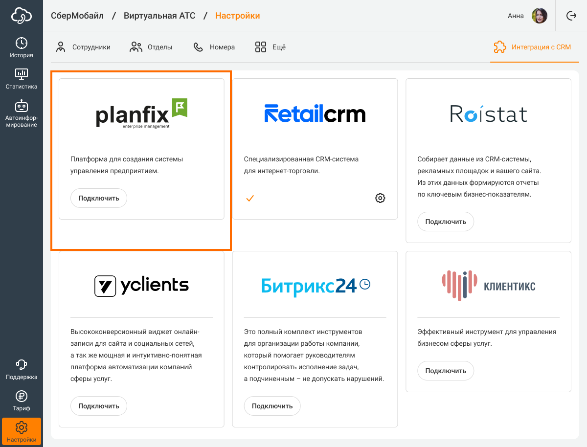 Скопируйте токен телефонии и перейдите в ВАТС. В разделе «Настройки» в правом верхнем углу выберите «Интеграция с CRM». В списке CRM-систем найдите ПланФикс и нажмите «Подключить».