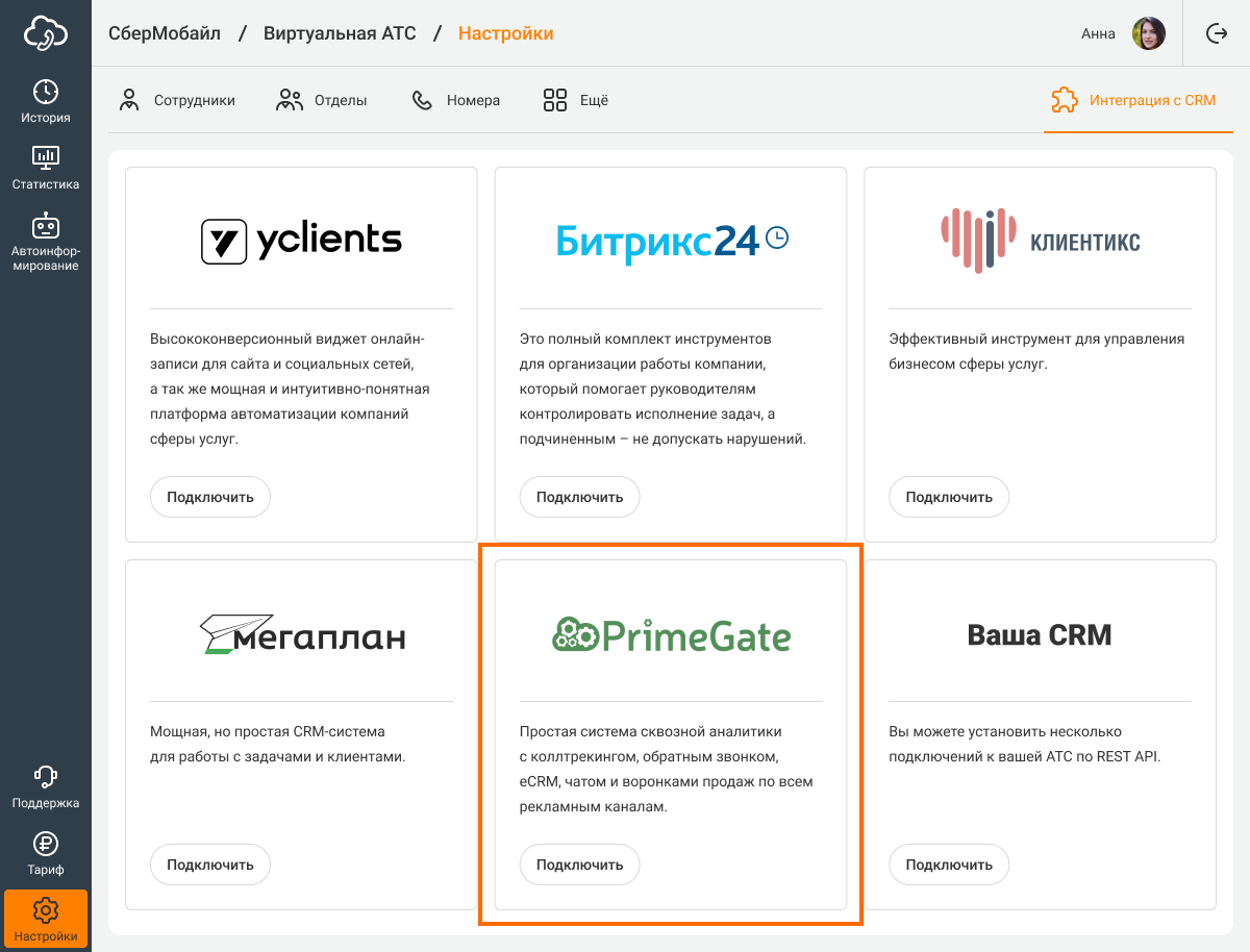 1. Зайдите в раздел «Интеграция с CRM» в Виртуальной АТС и нажмите «Подключить» у карточки PrimeGate.