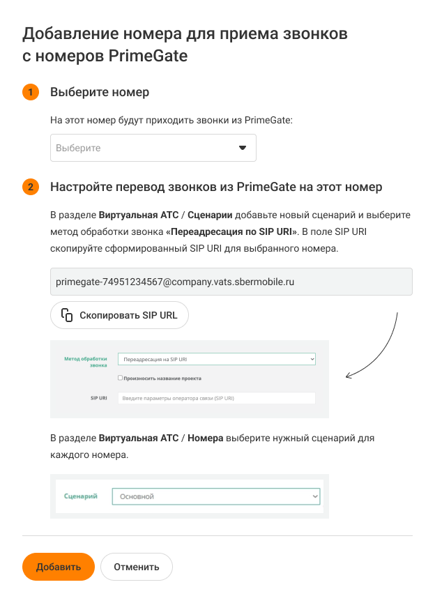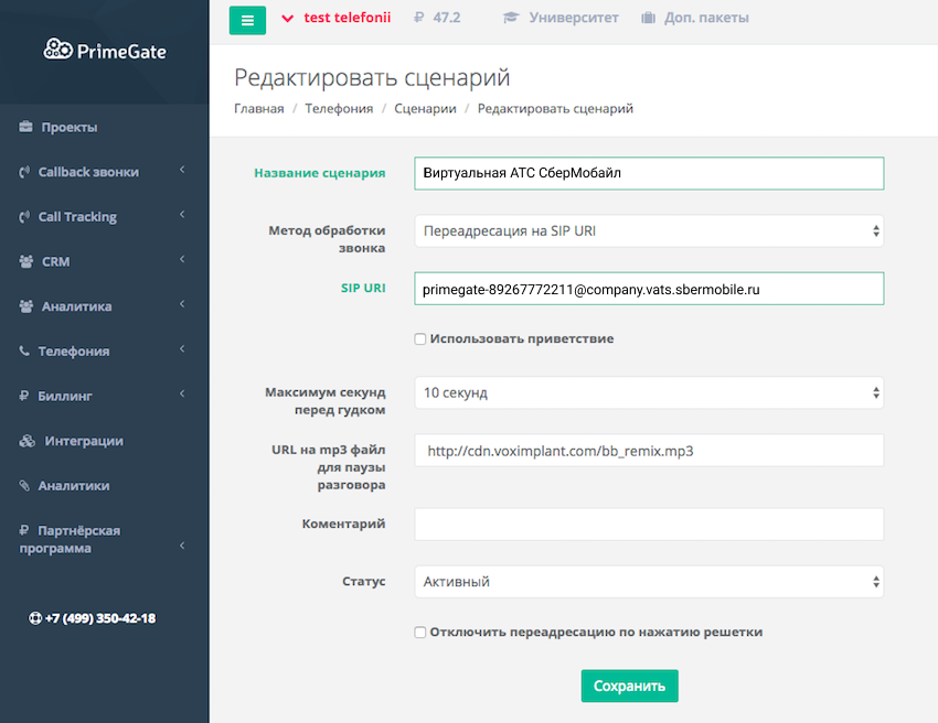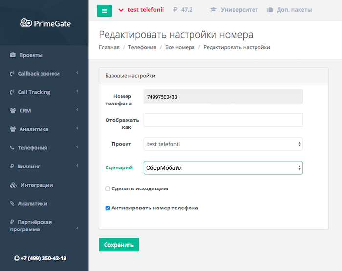 7. В разделе «Телефония» → «Номера» назначьте номеру PrimeGate добавленный сценарий.