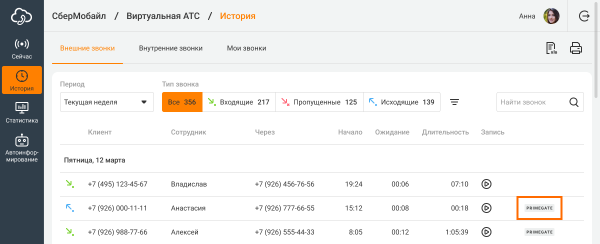 Теперь вы можете принимать звонки из PrimeGate в вашей Виртуальной АТС. Звонки, поступившие из Primegate, будут отмечены специальным символом.