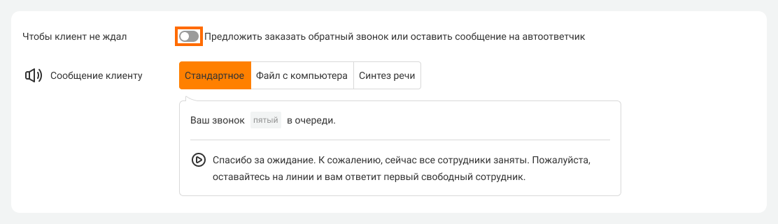 Клиентам, которые не хотят ждать на линии, можно предложить заказать обратный звонок. При этом позвонивший клиент сохраняет свою позицию в очереди и, как только один из сотрудников отдела освободится, система позвонит сначала сотруднику, затем клиенту.