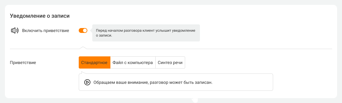 Даже при исходящих звонках ваш клиент и ваш сотрудник услышат предупреждение о записи. По умолчанию Виртуальная АТС будет проигрывать стандартное сообщение, но вы в любой момент можете заменить его на свой файл с компьютера или озвучить текст уведомления о записи с помощью функции «Синтез речи».