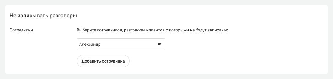 - Если во время одного звонка клиента разговаривало несколько сотрудников, в том числе сотрудник с запретом записи, то не запишется весь звонок.