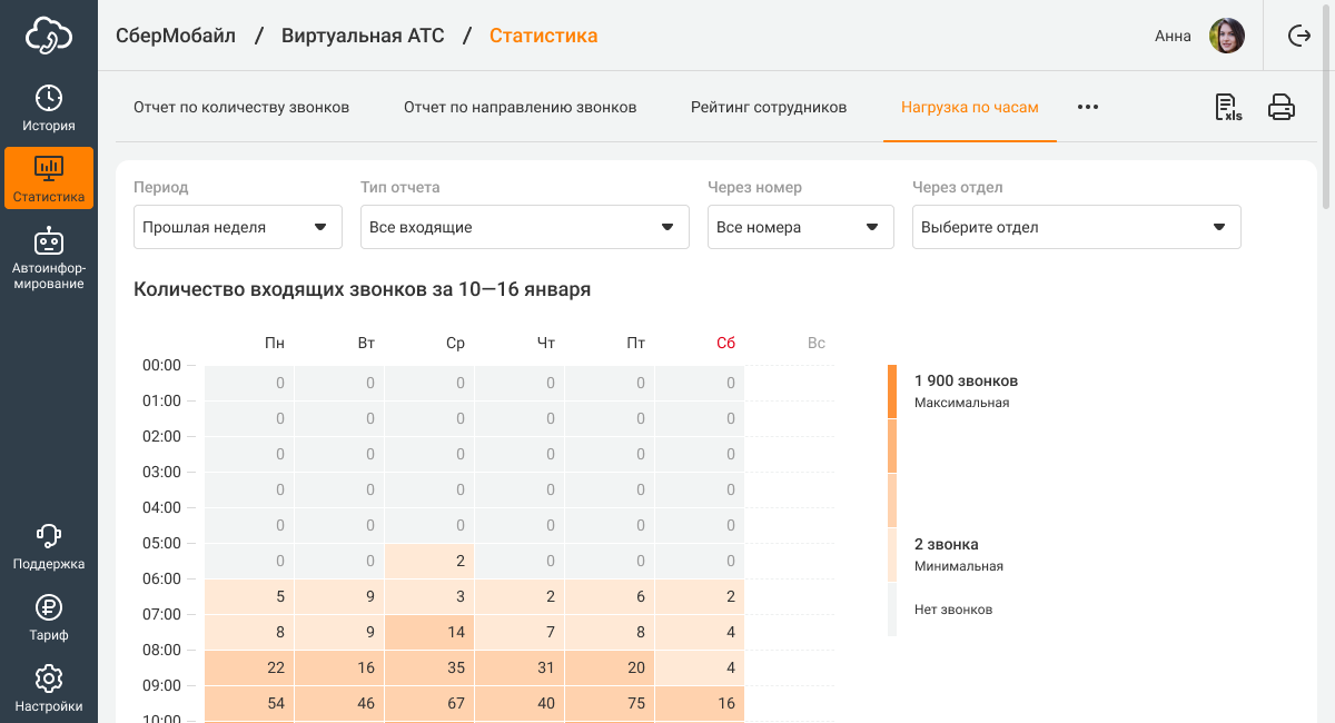 Отчет «Нагрузка по часам» показывает, в какое время и в какие дни недели сотрудники чаще и дольше всего общаются с клиентами.