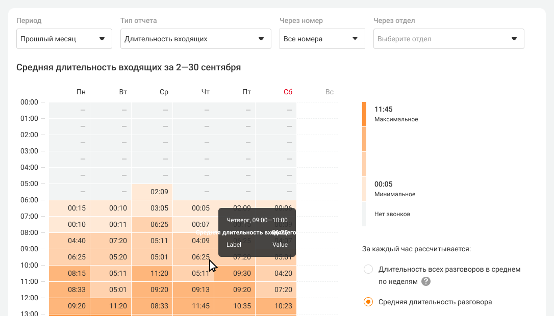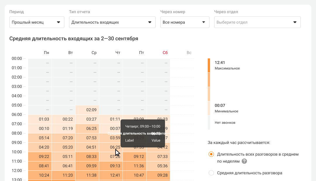 • Длительность всех разговоров в среднем по неделям — это средняя суммарная длительность входящих в этот час в выбранном периоде. Значение ячейки «Чт с 9:00 до 10:00» в таком случае будет рассчитываться иначе: