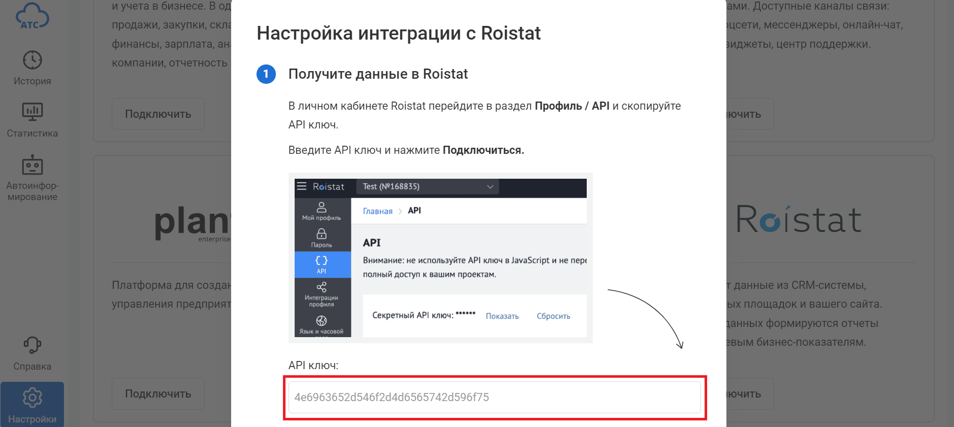 4. Вернитесь на вкладку Виртуальной АТС с настройками интеграции, вставьте скопированный ключ API и нажмите кнопку «Подключиться».