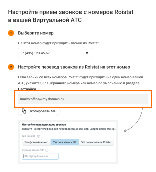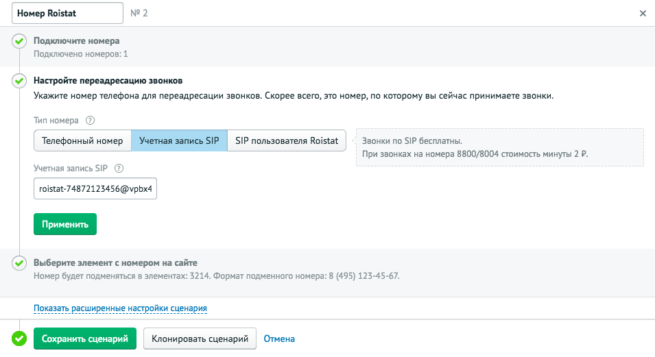 6. Выберите номер Виртуальной АТС, на который будут перенаправляться звонки с номеров Roistat. Скопируйте сгенерированный SIP-адрес. Нажмите кнопки «Применить» и «Сохранить».