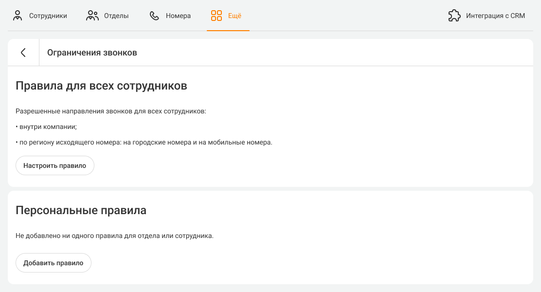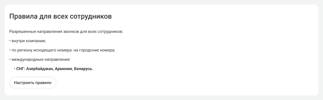С помощью этих правил вы можете разрешить сотрудникам совершать звонки по определенным направлениям или запретить все исходящие вызовы, кроме внутренних и по региону номера.