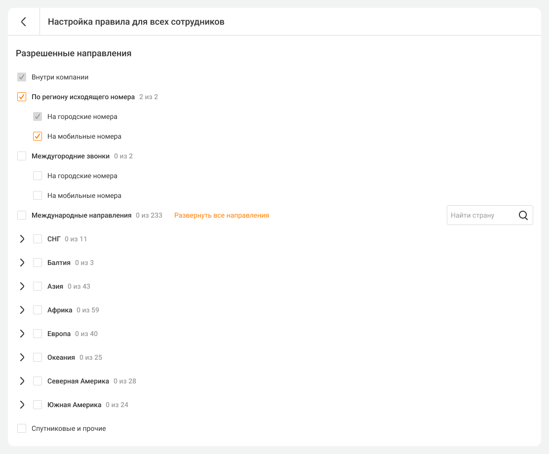 Выберите направления звонков, по которым сотрудники смогут совершать исходящие.
