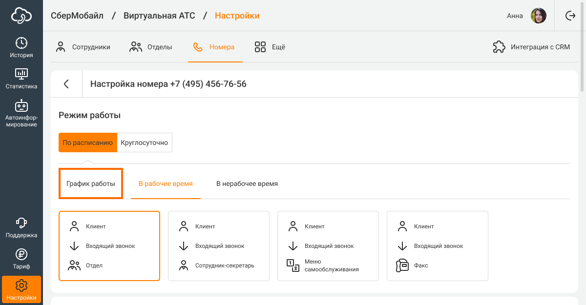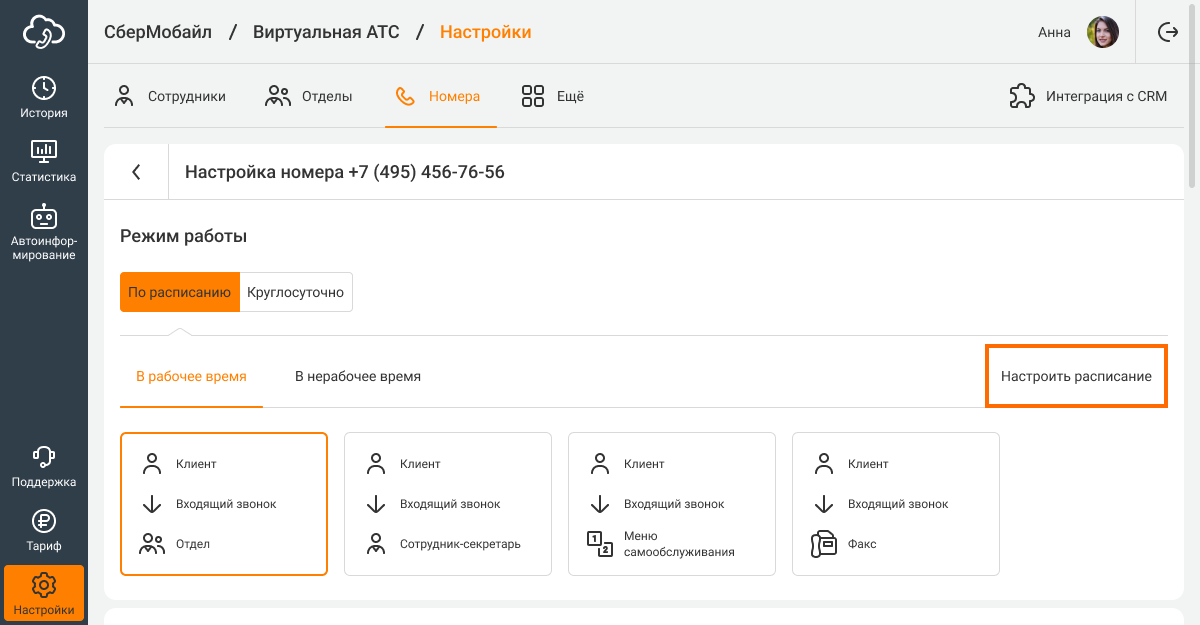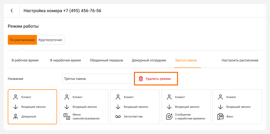 Выберите номер, для которого нужно установить расписание. В разделе «Режим работы» перейдите на вкладку «По расписанию» и нажмите «Настроить расписание».