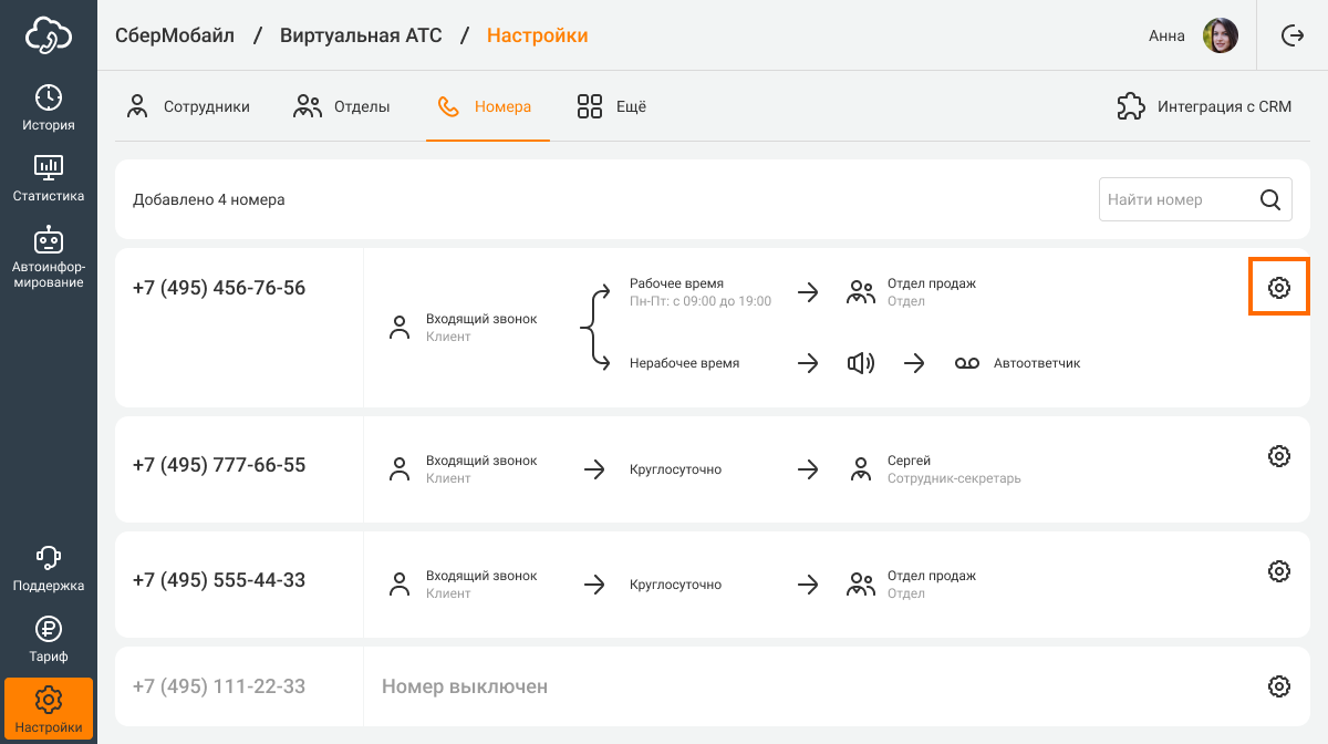 1. В разделе «Номера» – «Общие номера компании» выберите номер, один из режимов которого нужно удалить, и перейдите в его настройки.