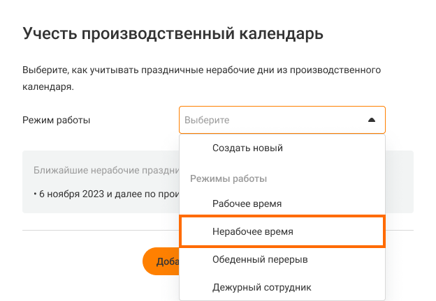 Обратите внимание: если в праздничные дни звонки на номер будет принимать дежурный сотрудник, при настройке производственного календаря в режиме работы выберите вариант «Дежурный сотрудник» и настройте прием звонков.