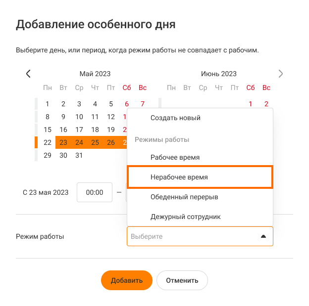 • особенный день – 16 мая с 8:00 до 9:00. И выберите режим работы для этого интервала – нерабочее время или дежурный сотрудник;