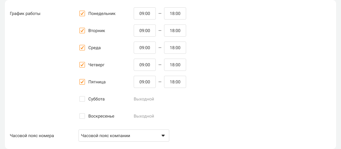 По умолчанию для каждого номера график работы устанавливается в часовом поясе компании. Но если настраиваемый номер должен принимать звонки в другом часовом поясе, отметьте это в расписании номера.